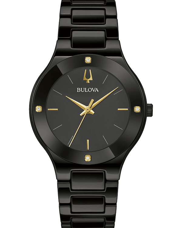 Introducing the Bulova Ceramic Millennia Model 98R293 from the Modern Millennia collection. This timepiece boasts a black ceramic case and bracelet with gold-tone stainless steel accents, adorned with four diamonds. Its black metalized domed crystal surrounds a black mother-of-pearl dial, creating a sleek and sophisticated look.