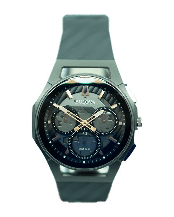 Bulova CURV Model: 98A162, the world’s first curved chronograph movement features high-performance quartz technology with 262 kHz vibrational frequency for precise accuracy. The Five-hand chronograph in a gray stainless steel case with black and transparent brown dial, gray hands, and markers, has an anti-reflective curved sapphire crystal.