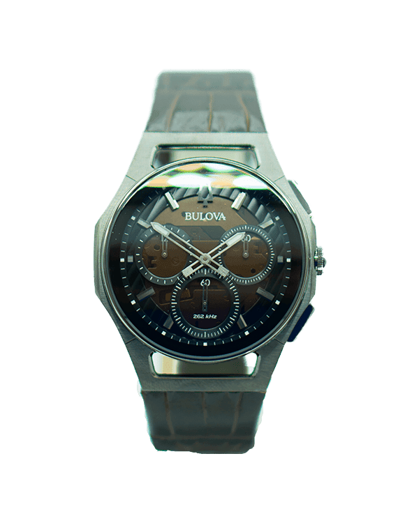 Bulova CURV Model: 98A231, the world’s first curved chronograph movement features high-performance quartz technology with 262 kHz vibrational frequency for precise accuracy. The Five-hand chronograph in a gray stainless steel case with black and transparent brown dial, gray hands, and markers, has an anti-reflective curved sapphire crystal.