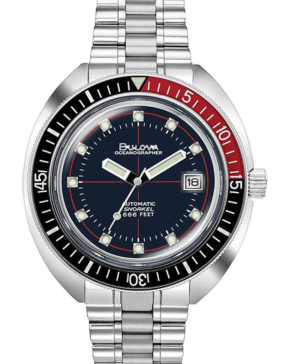 Introducing the Bulova Devil Diver Automatic 98B320, a tribute to the acclaimed 70s Oceanographer diver watch. Powered by a self-winding mechanical movement, this timepiece ensures precision timekeeping. The stainless steel screw-back case with screw-down crown provides durability, while the black/red unidirectional bezel and luminescent markers on the black dial ensure visibility underwater.