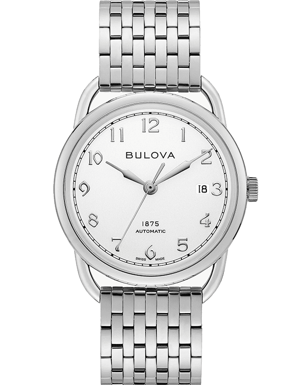 Introducing the Bulova Joseph Bulova Commodore 96B326 from The Joseph Bulova Collection, a tribute to the brand’s visionary founder. This  Bulova Joseph Bulova Commodore 96B326 features a stainless steel case with a sleek white dial and applied markers for a refined aesthetic. The open case back showcases a fine Swiss-made 26-jewel automatic movement, adorned with the Joseph Bulova signature, “1875,” and “Swiss Made,” along with a custom-designed rotor.