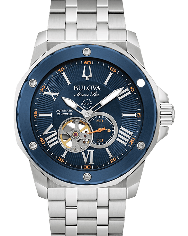 With an open heartbeat automatic movement visible through both the dial and case back. This Bulova Marine Star Automatic 98A302 boasts 21 jewels and a 42-hour power reserve. Completed with a matching silver-tone stainless steel bracelet and push-button deployant clasp, it’s water-resistant to 200 meters, ensuring reliability wherever you go.