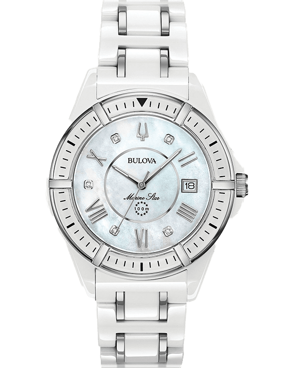 Introducing the Bulova Marine Star Ceramic 98P172 from the Marine Star Collection. Featuring a white ceramic case with stainless steel accents and five hand-set diamonds on a silver-white dial. With a mother-of-pearl inner dial, date feature, and sapphire glass, this timepiece exudes elegance.
