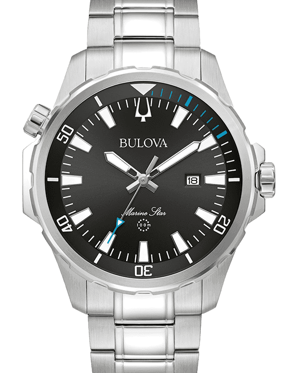This Bulova Marine Star Model: 96B382 also has a fold-over buckle closure and is water-resistant up to 100 meters. For a Bulova timepiece that makes a standout statement, this Marine Star is a perfect choice.