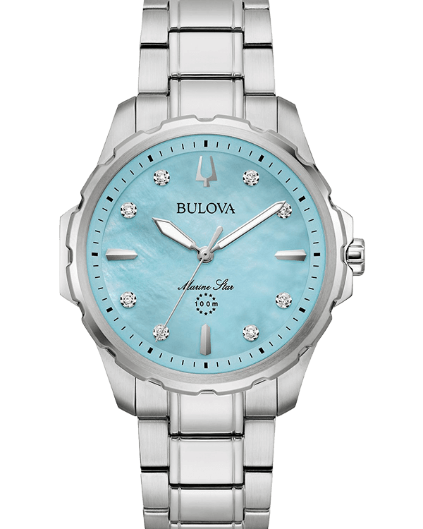 The lustrous blue mother-of-pearl dial features eight diamond hour markers and luminescent hands for exceptional legibility. Paired with a dual-finished silver-tone stainless steel bracelet with quick-release and deployant closure for comfort and security. Elevate your style with the Bulova Marine Star Model 96P248, the perfect companion for any occasion.