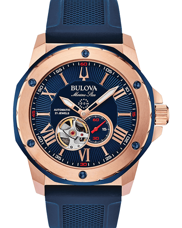 Introducing the new Bulova Marine Star Model 98A227 featuring a three-hand automatic movement showcased in an open aperture. This timepiece is appealing to every eye, and is a MUST HAVE in your collection.