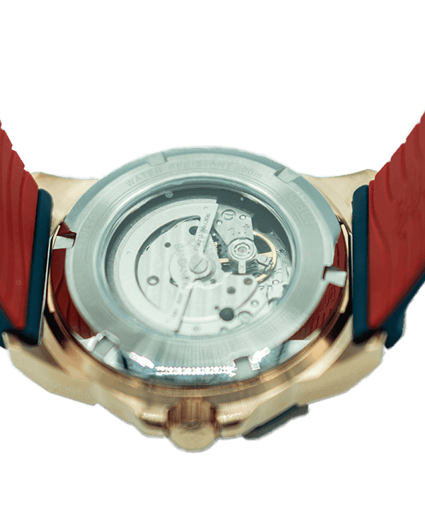 This Bulova Marine Star Model 98A227 has a rose gold-tone stainless steel case with a blue tone outer ring. Blue dial with flat mineral crystal. Blue textured silicone strap with a contrasting red underside. And of course, the watch is water-resistant up to 200 meters.