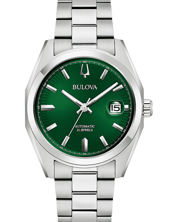 The green dial features silver-tone accents, luminescent hands, minute markers, and a magnified date display for enhanced functionality. Powered by an automatic 21-jewel movement with a 42-hour power reserve, visible through the exhibition caseback. For those seeking refined luxury, the Bulova Surveyor Green Dial Model 96B429 is the obvious choice.