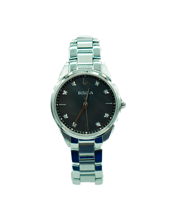 Looking for a perfect gift for the special lady in your life? Look no further. Presenting the Bulova Sutton Model: 96P198. Featuring its slim stainless steel case, this watch is paired with a lustrous black Mother-Of-Pearl dial.