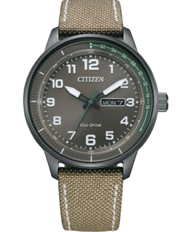 The Citizen Tactical Day-Date Men’s Watch offers a black stainless steel case and comfortable beige nylon strap. The brown dial features luminous silver-tone hands and Arabic numerals, complete with a day-date display at 3 o’clock, designed for functionality and style.