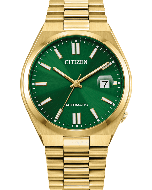 The Citizen TSUYOSA Automatic NJ0152-52X blends ultramodern sports styling with everyday elegance. Crafted with a 40mm gold-tone stainless steel case and a seamlessly integrated matching bracelet, this watch makes a bold statement. The sunray green dial, protected by an anti-reflective sapphire crystal, features a 3 o’clock date window and contrasting gold-tone details, adding a touch of classic sophistication.