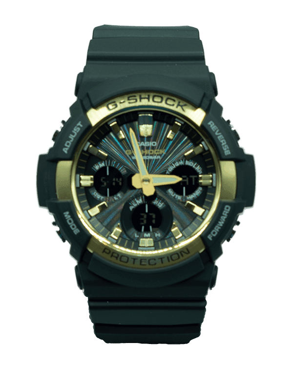 New, from G-SHOCK, this Men’s Casio G-SHOCK GAS100G-1A. Featuring the all-new stainless steel bezel with a Gold-plated ion finish.