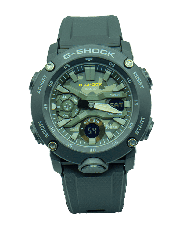 The Men’s Casio G-SHOCK Model: GA2000SU-1A combines a camouflage-pattern dial with practical utilitarian colors that go well with street fashion. The design exudes a casual individuality and goes well with various types of clothing and environment.