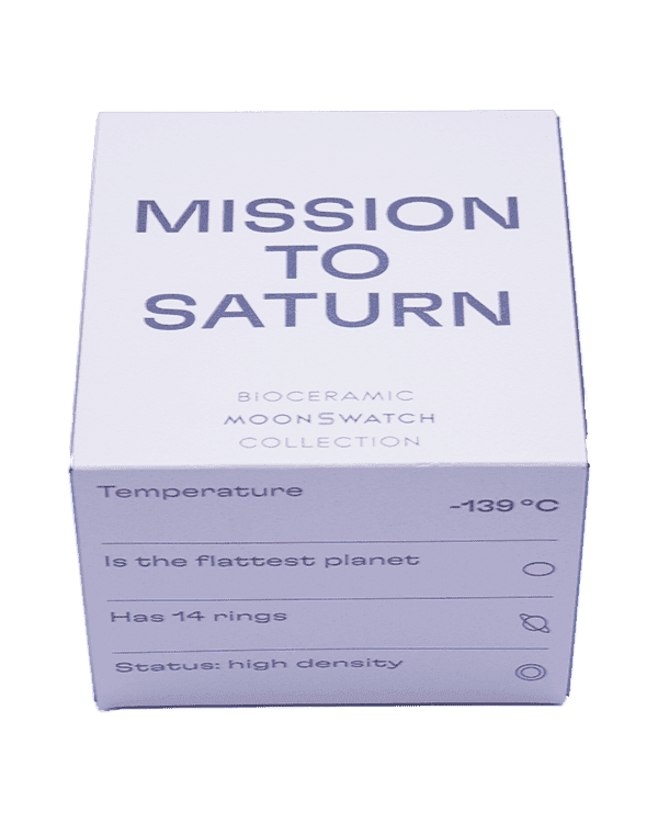 All dials carry the OMEGA X SWATCH branding, as well as the iconic Speedmaster logo and the new MoonSwatch logo. The glass construction on this MOONSWATCH MISSION TO SATURN, the “hidden” S is integrated into the center of the crystal, and of course, the unique Bioceramic touch is common to all models and stands for a passionate love for details. All hours, minutes, chronograph seconds hands, and hour markers on this MOONSWATCH MISSION TO SATURN sport superluminova for a perfect glow in the dark.