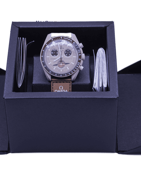On this MOONSWATCH MISSION TO SATURN model, sandy, cool beige tones contrast nicely with a brown dial and VELCRO strap. The MOONSWATCH MISSION TO SATURN feature chronograph seconds hand, subdial hands, and tachymeter scale background are also in brown. The MOONSWATCH MISSION TO SATURN seconds subdial depicts Saturn’s rings.