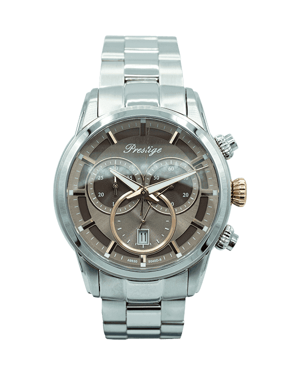 The case is 43mm, stainless steel with a gold-tone crown, and can resist pressure and water up to 10 ATM, 100M, or 330ft. It also sports a stainless steel bracelet. Furthermore, this beautiful Prestige Swiss Chrono A9830TR/B-BRN features a sapphire crystal. Sapphire is the second hardest gemstone hence the crystal will resist major scratches. Lastly, the movement in this beautiful Prestige timepiece is a Swiss-built, Ronda Cal. 5040D quartz movement.