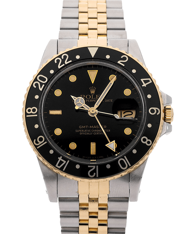 The Rolex GMT Master 1 1675 with a black dial on a two-tone jubilee bracelet is a classic timepiece that perfectly combines elegance with functionality. This vintage piece is powered by the renowned Rolex automatic movement, providing impeccable precision and reliability. The black dial, complemented by the signature 24-hour markers and luminous hands, is a perfect fit for those who need both style and utility. The two-tone stainless steel and 18k yellow gold jubilee bracelet adds a touch of luxury, while maintaining the rugged durability Rolex is known for.