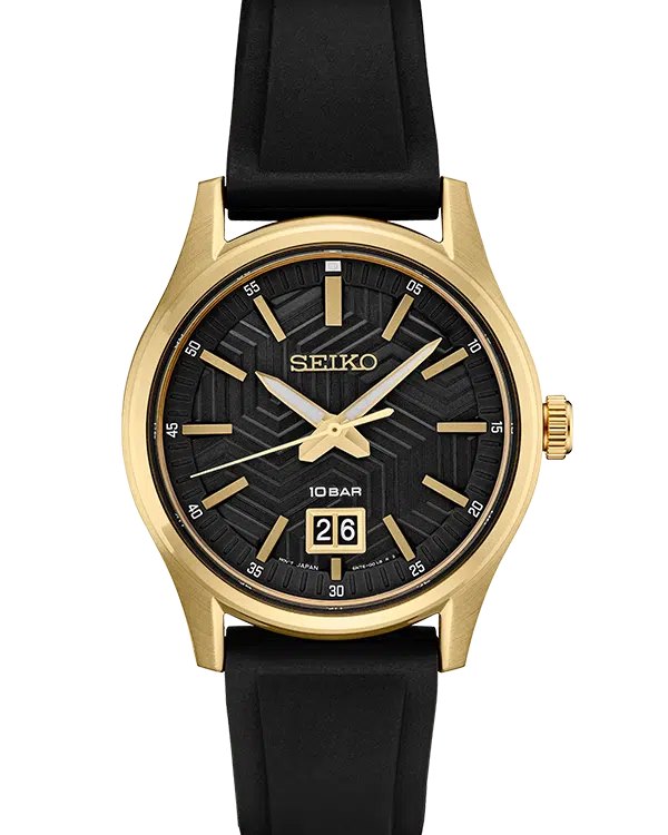 This Seiko Essentials SUR560 watch is designed to evoke the cool excitement of a night run, offering a slim profile for sleek sport or everyday wear. The matte textured black dial with gold accents features a y-shaped shoe-sole inspired pressed pattern, adding a streetwear edge.