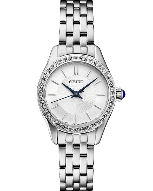 This Seiko Ladies Model: SUR539 features a diamond bezel, with a white dial. The dial finished in a white sunburst pattern pairs perfectly with the Stainless steel hands and markers. The watch is 26mm in diameter, making it a perfect size for any wrist.