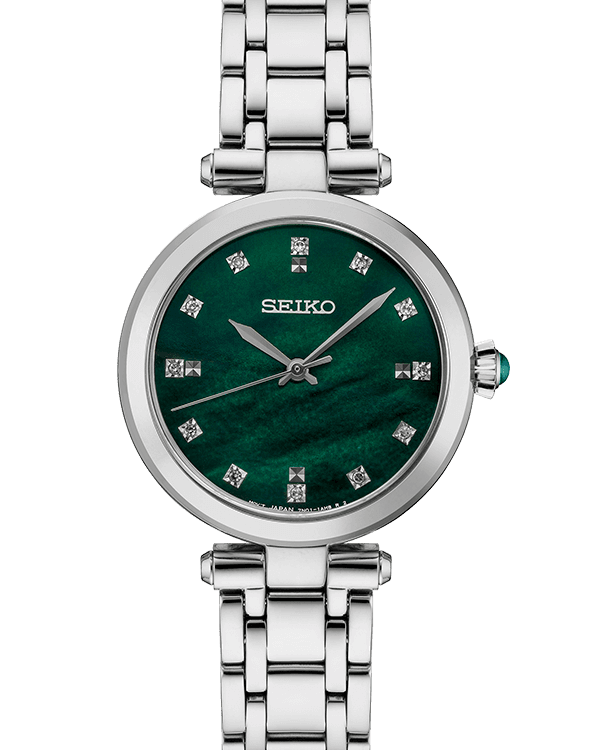 This Seiko Ladies Model: SUR539 features diamond markers, with a Green dial. The dial finished in a Green mother of pearl pattern pairs perfectly with the Stainless steel hands and markers. The watch is 30mm in diameter, making it a perfect size for any wrist.