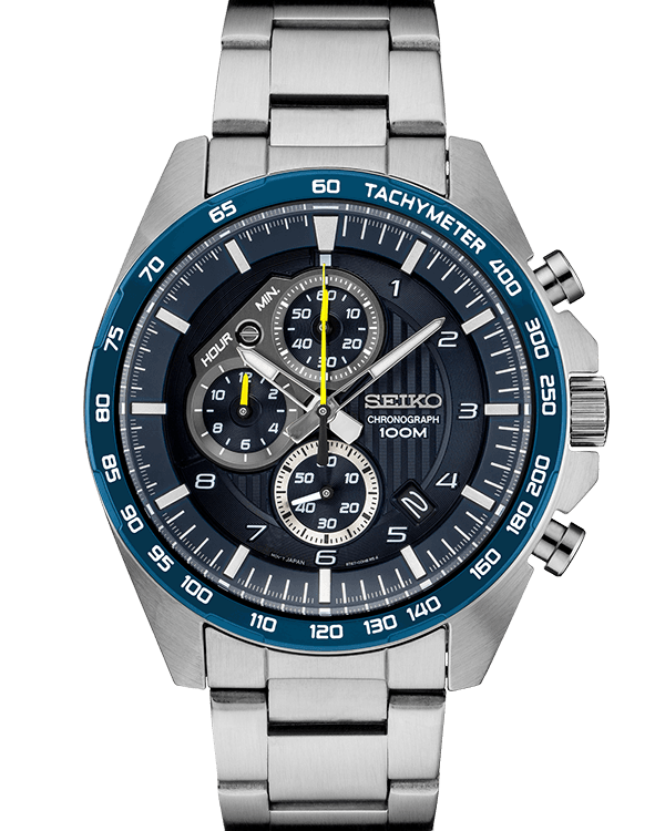 This Seiko Men’s Essentials Model SSB321  features a date display, with a Chrono dial. The dial finished in a linear blue color pairs perfectly with the stainless steel hands and markers. The watch is 44mm in diameter, making it a perfect size for any wrist.