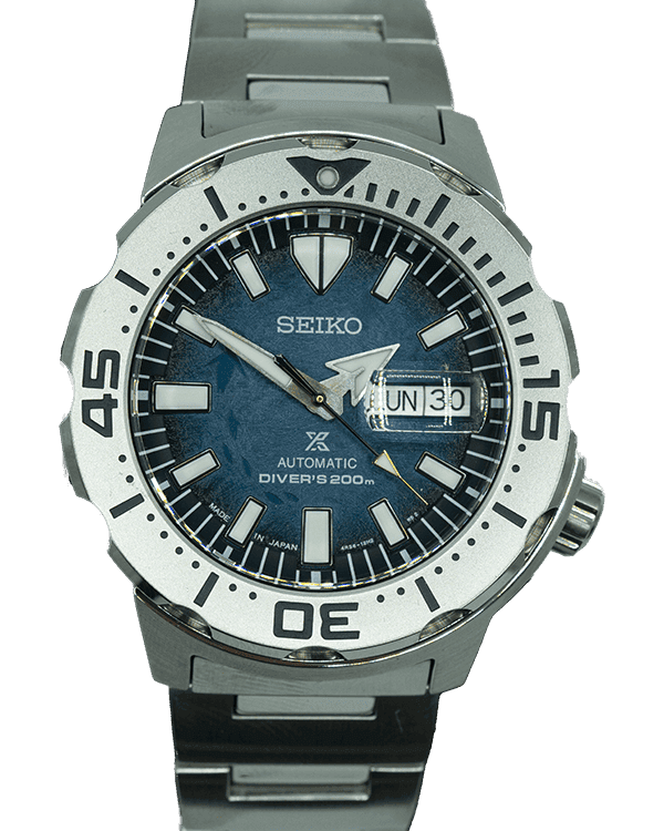 Seiko Men’s Prospex Series Model SRPH75 “SAVE THE OCEAN”. This Seiko comes with a high-quality 24-jewel automatic movement. This Seiko features approximately 40 hours of power reserve. The watch case is stainless steel, with a sapphire crystal and stainless steel strap.
